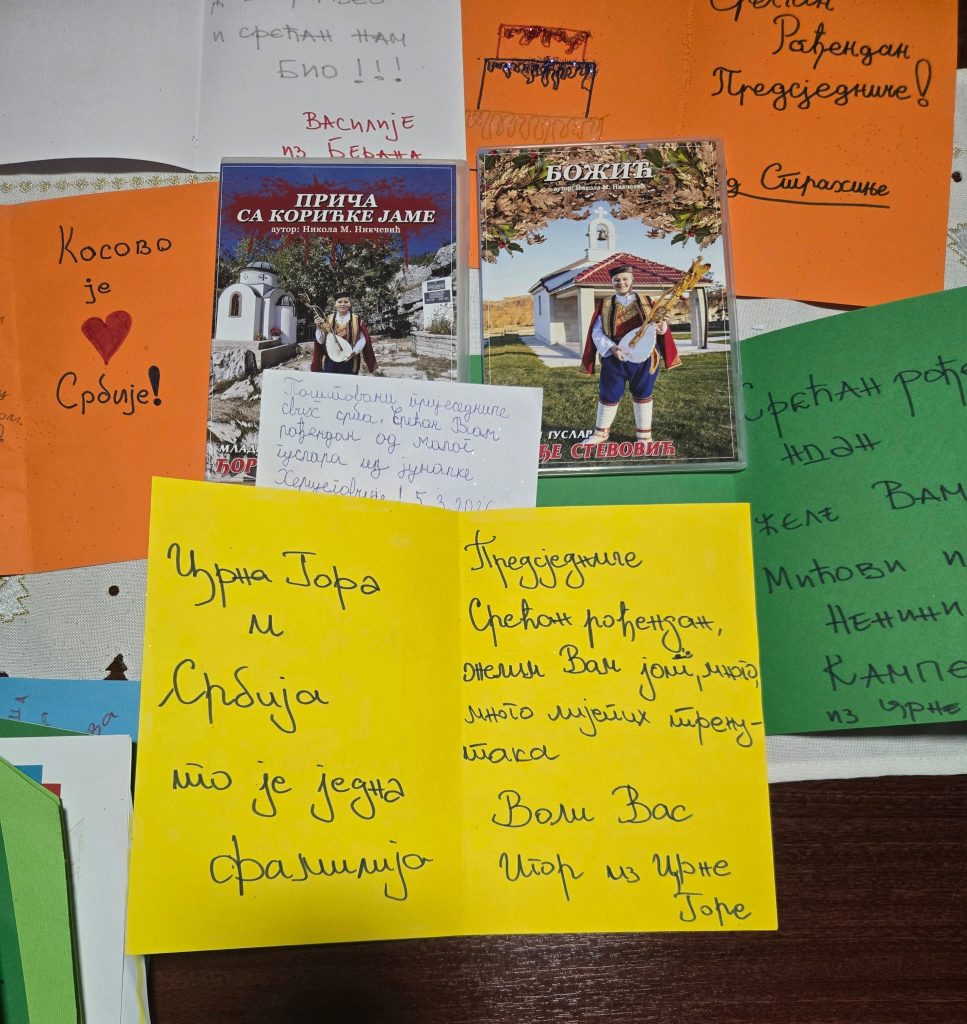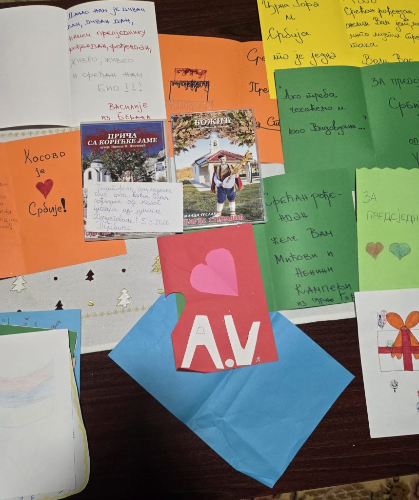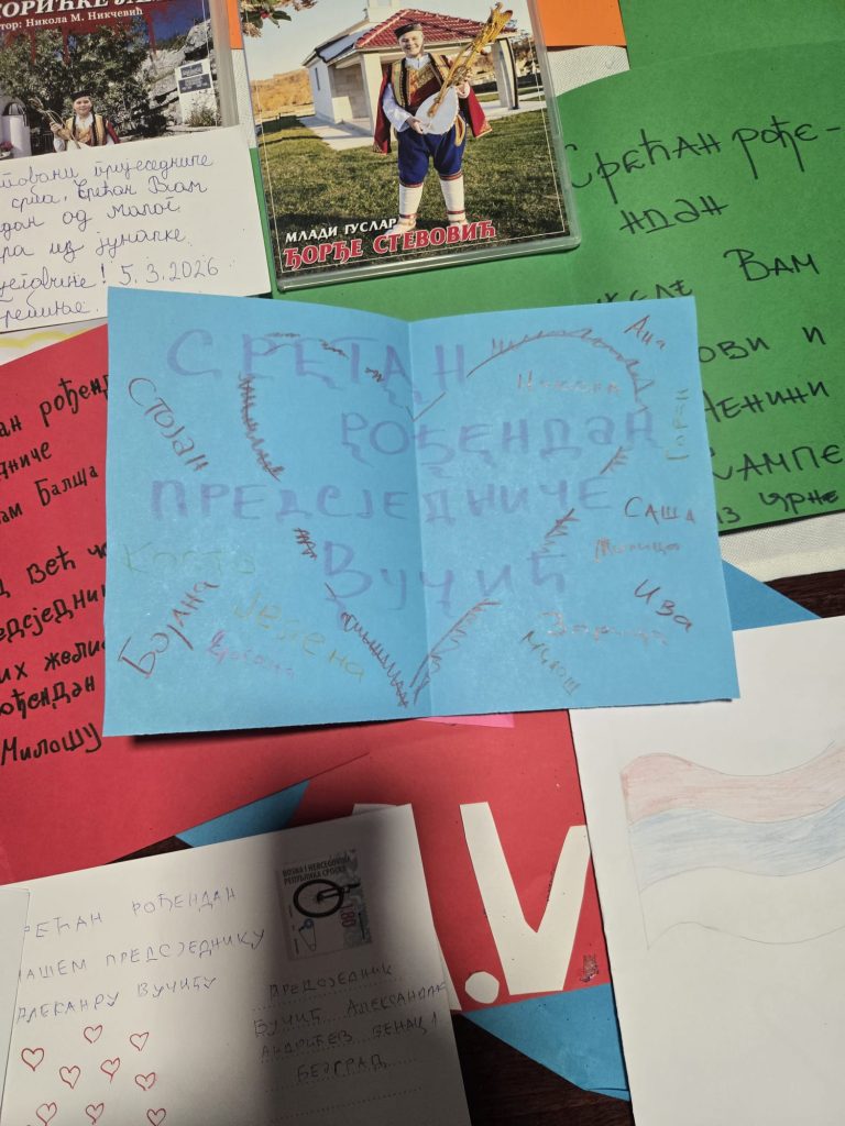 Поводом рођендана председника Републике Србије Александра Вучића, стигле су бројне руком писане честитке деце из Републике Српске и Црне Горе. Украшене срцима, тробојкама и дечјим цртежима, исписане крупним словима и искреним речима, ове честитке носе једноставне, али снажне поруке – жеље за здравље, снагу, мудрост и успех у вођењу државе. У њима нема протокола, већ само чиста дечја емоција и осећај припадности.