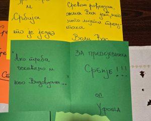 Посебну емоцију носе аутентичне дечје реченице: „Срећан рођендан нашем председнику“, „Желимо Вам здравље, срећу и љубав“, „Да 100 година славите“, али и поруке попут „Чувајте нам Косово и Метохију“ и „Косово је срце Србије“. У једној од честитки стоји и жеља: „Да до године славите у Призрену“. Ове једноставне речи сведоче о томе како најмлађи доживљавају државу, традицију и национални идентитет.